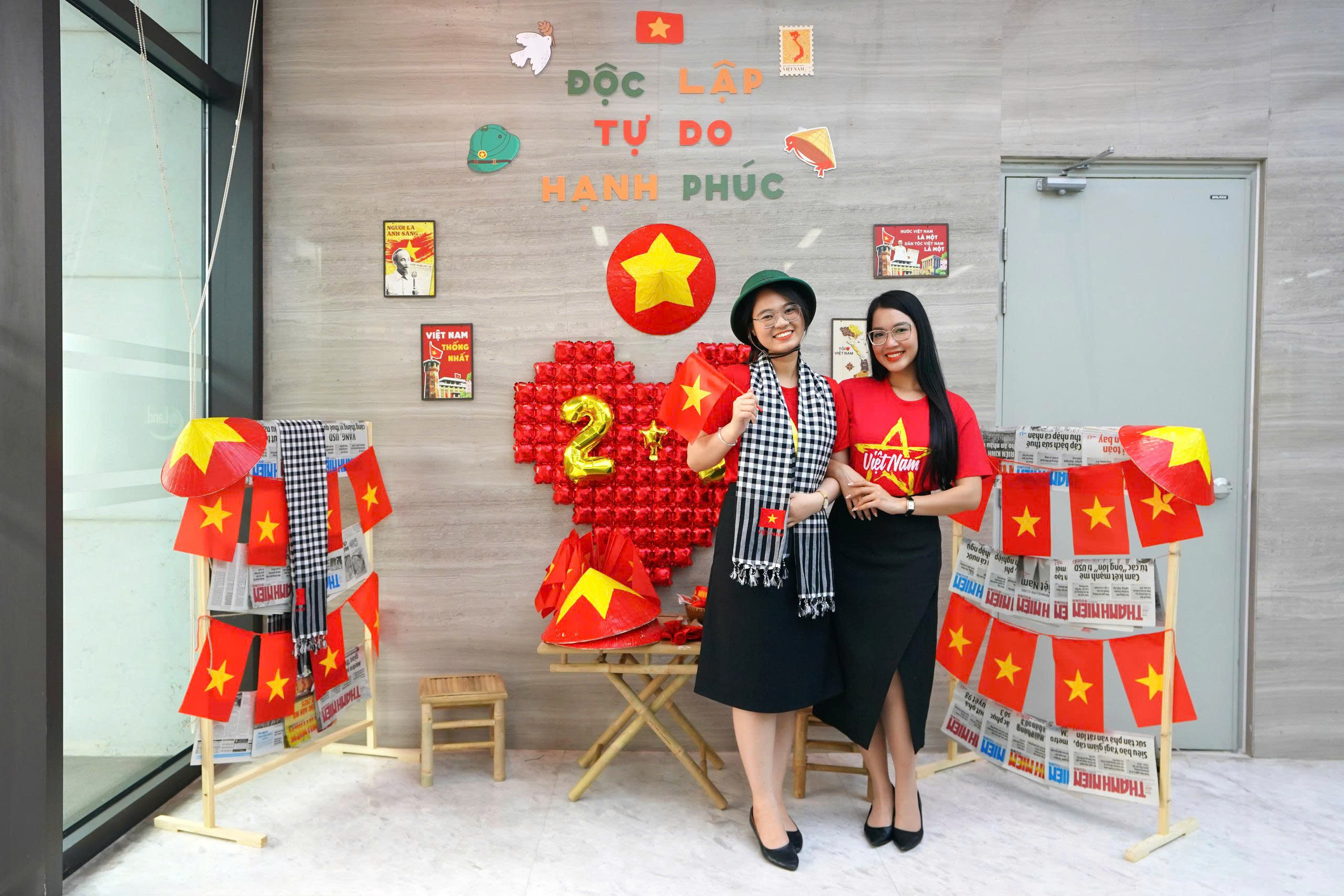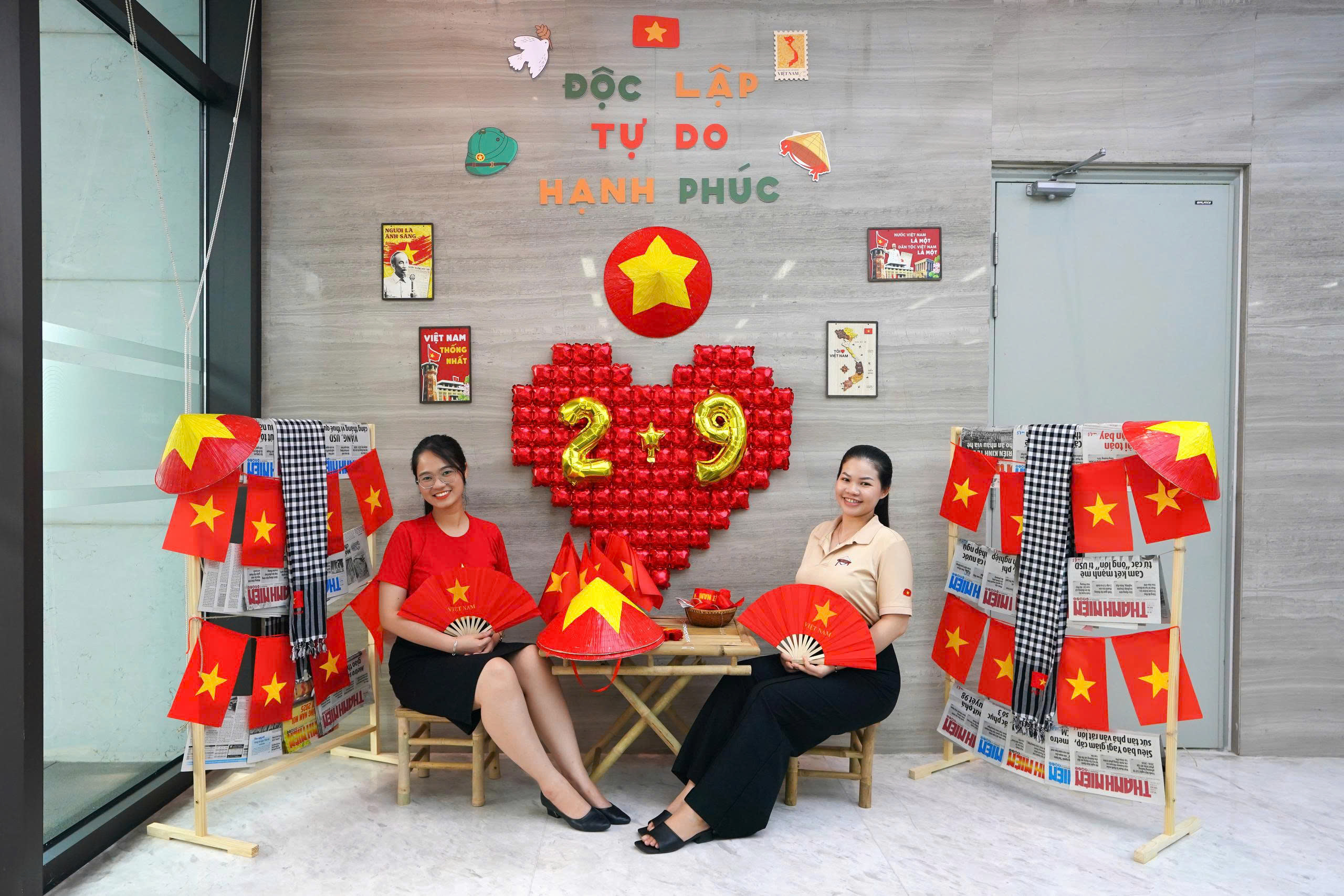 The highlight was the nostalgic “vintage newsstand” check-in corner, adorned with pith helmets, checkered scarves, and conical hats – a place where every member captured moments of togetherness, as if immersed in a national concert right within the workplace. More than just a check-in spot, it became a space where emotions were awakened, national pride was celebrated, and the spirit of solidarity was ignited.