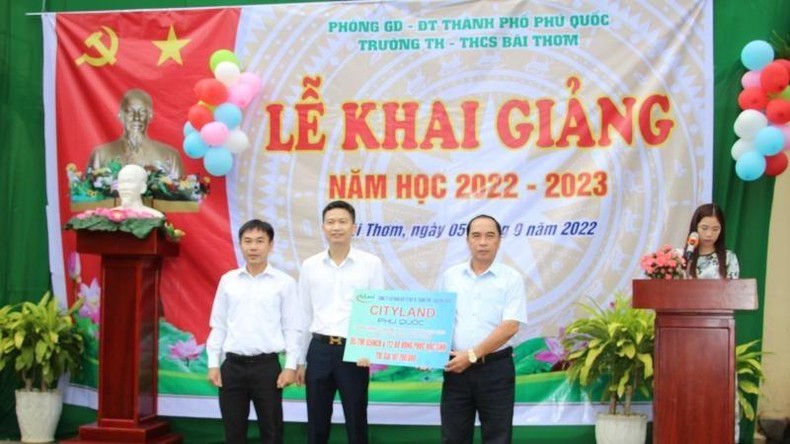 On the morning of September 5, students of Bai Thom Primary and Secondary School, located in Bai Thom commune, Phu Quoc City, Kien Giang Province, attended the Opening Ceremony of the new academic year with great joy as they received meaningful gifts from various businesses. Among the highlights was the official inauguration of the Rach Tram School campus—valued at VND 17 billion—sponsored by CityLand Group .